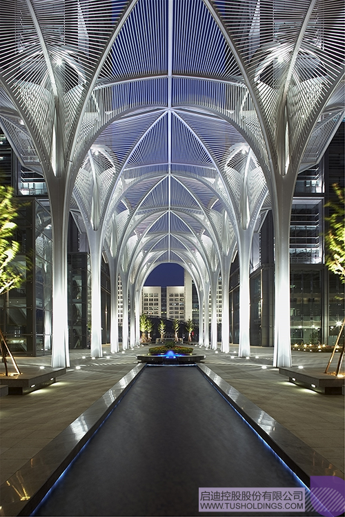 分列的四塔間隙為城市道路通向園區(qū)中心綠地打開了一條綠色通廊,中心是12顆參天鋼樹,形成灰空間的限定,與二層平臺自然的樹木共同營造出積極的公共交往空間。“樹影婆娑”下是綠意盎然的休閑廣場,展現人與自然共生共融的景象。建筑首層斜插入地下的草坪,標準層四角的綠色陽臺和頂層白色膜傘的屋頂花園無不體現了人性化、生態(tài)化的現代商務辦公理念。