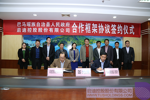 啟迪控股常務副總裁、啟迪科技城集團董事長陳響(前排左)與廣西巴馬縣長藍海洲(前排右)簽署大健康產業合作框架協議